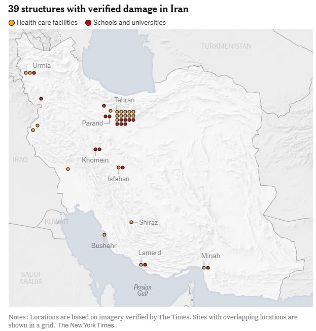 The New York Times tərəfindən aparılan təhlilə görə, ABŞ və İsrailin İrana endirdiyi zərbələr nəticəsində azı 22 məktəb və 17 səhiyyə müəssisəsinə ziyan dəyib.